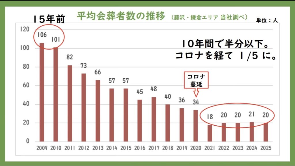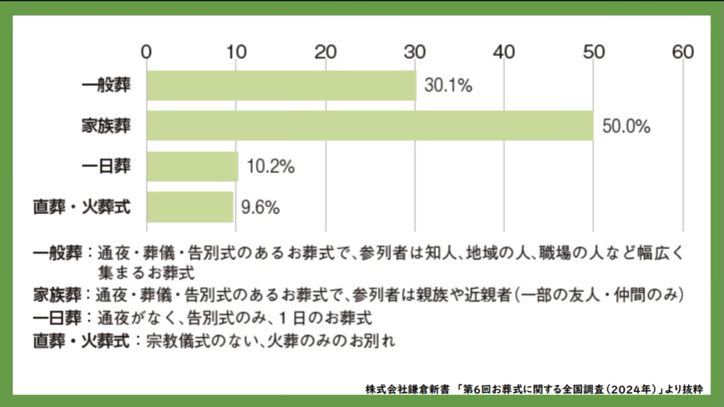 15年前からのデータでは平均会葬者数の減少が目立ち、特にコロナ渦を経てさらに減少した『家族葬』が50%を占めています。